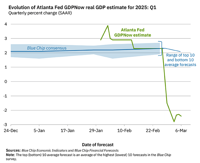The Trump administration's trade war has created widespread economic disruption and the economic indicators for Q1 2025 read like a coroner's report. The Federal Reserve Bank of Atlanta's GDPNow model projects a -2.8% contraction, deteriorating from -1.5% mere days earlier. Consumer spending growth has flatlined at 0.0%, while private investment growth has cratered from 3.5% to a bare 0.1%. Combined with rising prices across all industries, we now face textbook stagflation.