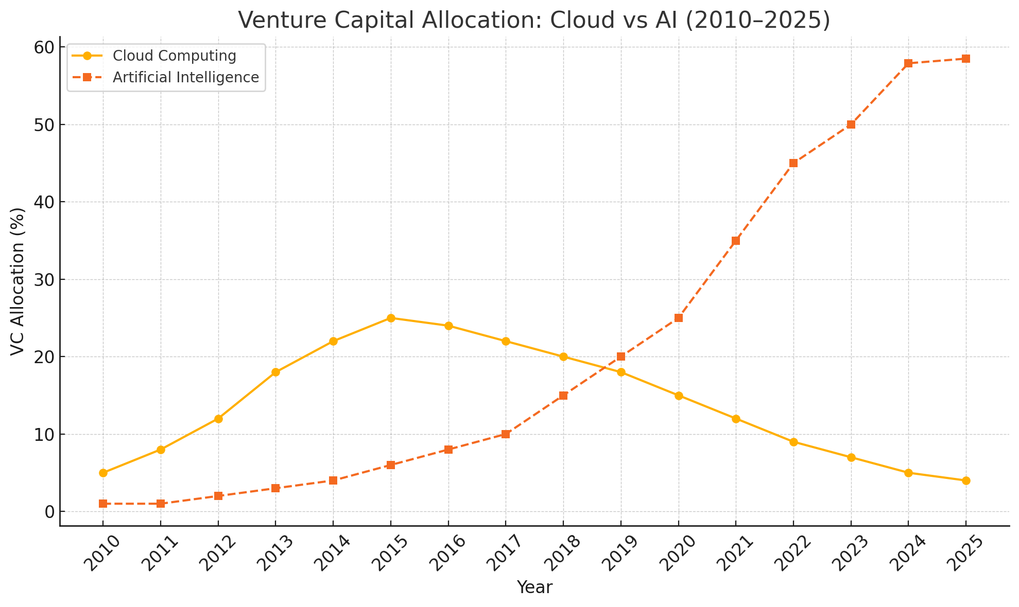 Figure: Venture Capital Allocation – Cloud Computing vs. Artificial Intelligence (2010–2025) Data visualization by John Cowan / © Next Wave Partners